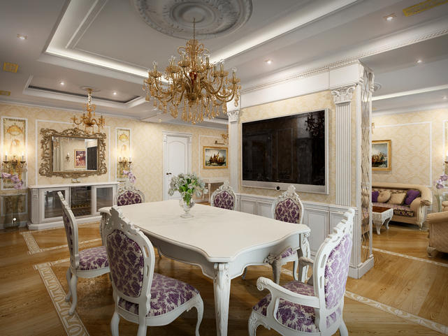 Style of work: exclusivity and premium level. Style elements are taken from Art Deco. Only top manufacturers of natural stone, tiles, parquet and other finishing materials were used.